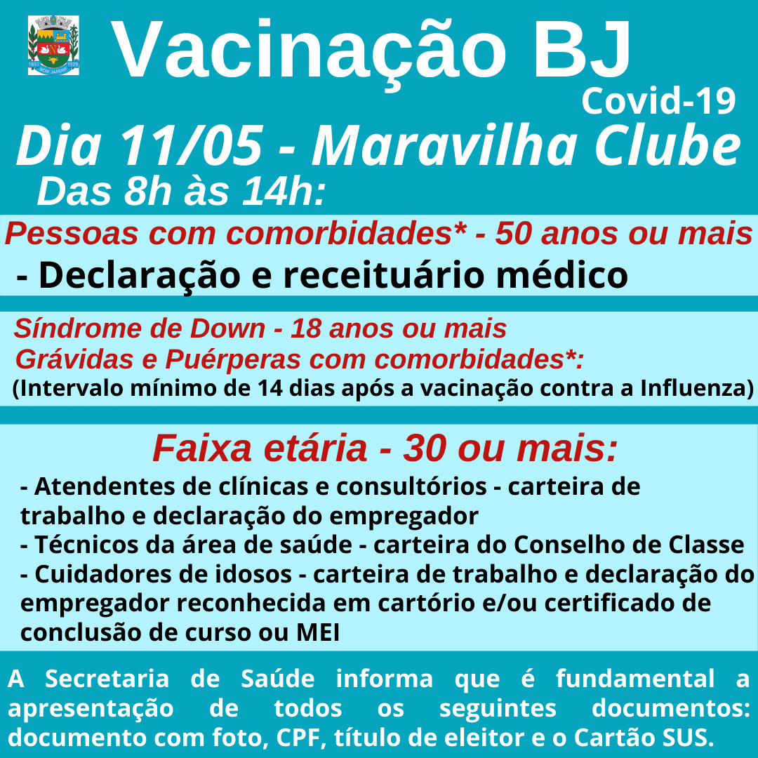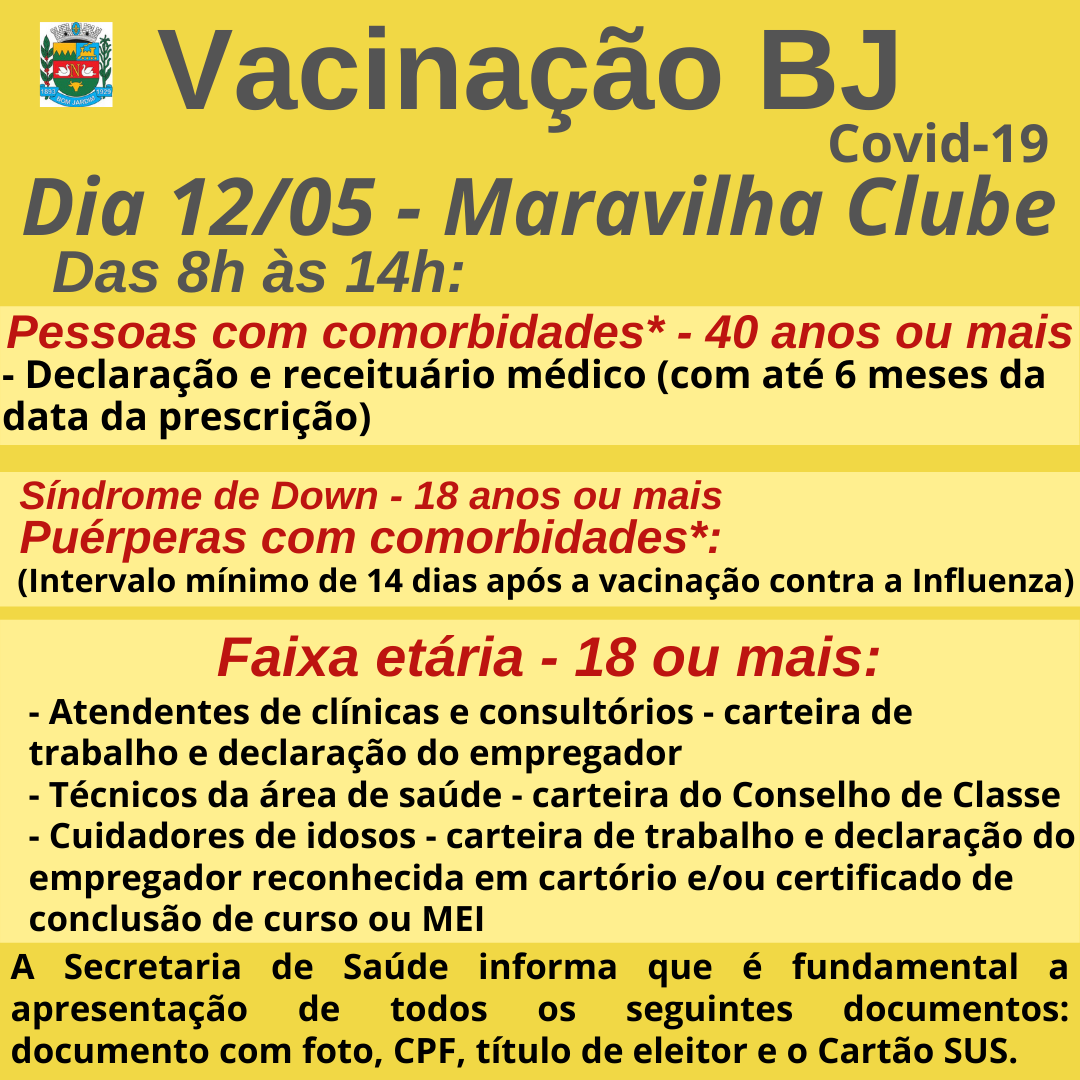 A Secretaria de Saúde de Bom Jardim, seguindo as determinações do Ministério da Saúde, iniciará amanhã, 06, a vacinação contra a Covid-19 em pessoas de 59 anos com comorbidades, além de grávidas e puérperas com comorbidades e o grupo de cuidadores de idosos, atendentes de clínicas e consultórios, e técnicos da área de saúde acima dos 50 anos.A Secretaria alerta que, além dos documentos de Identidade, CPF, Título de Eleitor e CPF, a pessoa deve apresentar a documentação específica definida para cada grupo a ser vacinado.A Campanha de Vacinação contra a Covid-19 em Bom Jardim continua sendo realizada no Maravilha Clube, das 8h às 14h.