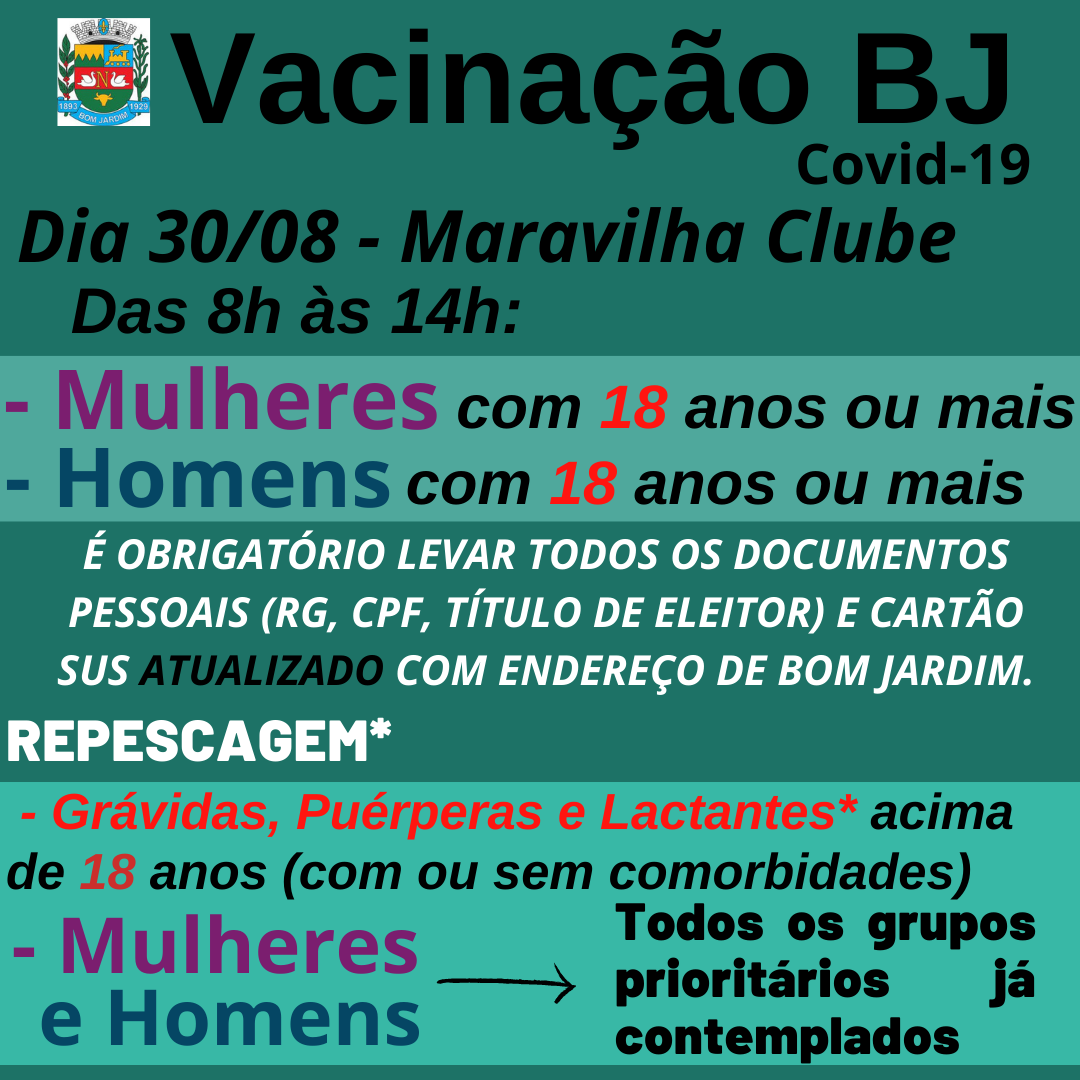 Dose de reforço para idosos com 64 anos ou maisSe você tem 64 anos e tomou a segunda dose da vacina contra Covid-19 há pelo menos 6 meses, dirija-se ao Centro de Vacinação (Bom Jardim Maravilha Clube) e tome a dose de reforço.Vacinas salvam vidas!