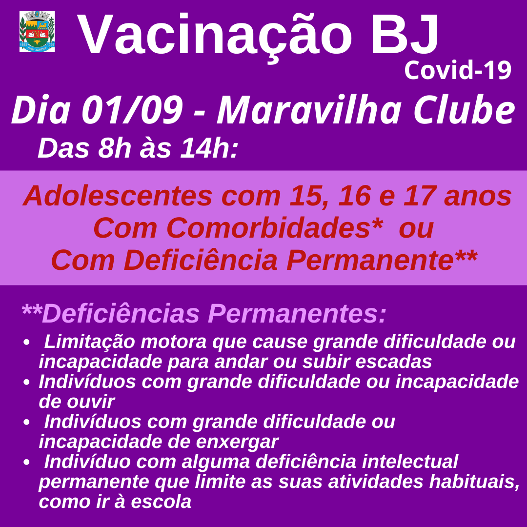 BJ vacina amanhã, dia 01, adolescentes de 15 a 17 anos com comorbidades ou deficiência permanente