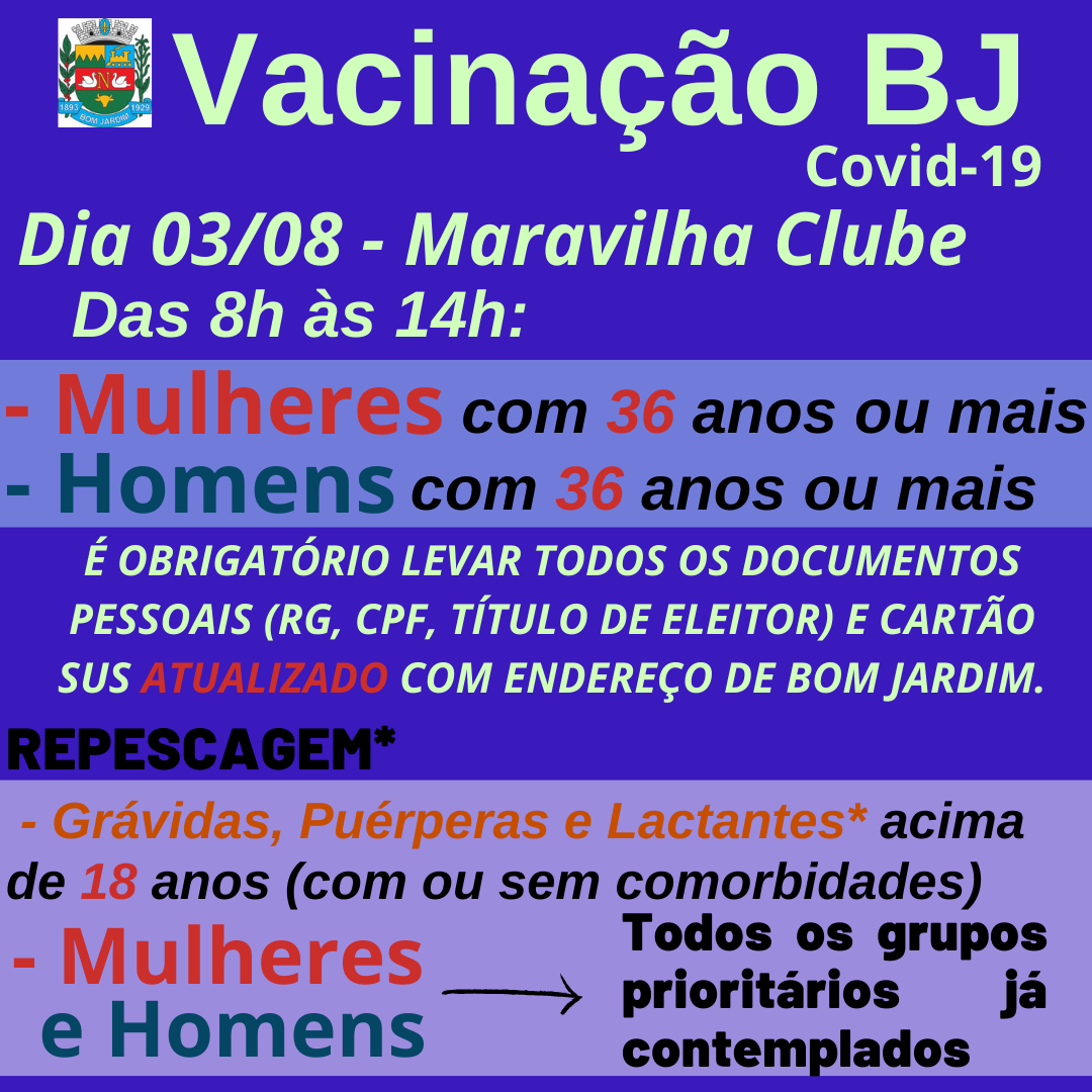 Dose de reforço para idosos com 64 anos ou maisSe você tem 64 anos e tomou a segunda dose da vacina contra Covid-19 há pelo menos 6 meses, dirija-se ao Centro de Vacinação (Bom Jardim Maravilha Clube) e tome a dose de reforço.Vacinas salvam vidas!
