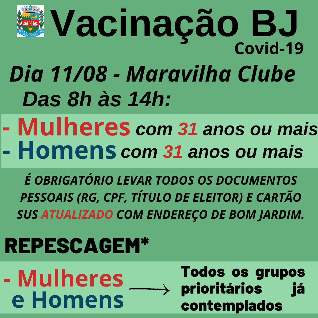 Vacinação contra Covid-19 no dia 11 de agosto: mulheres e homens com 31 anos ou mais