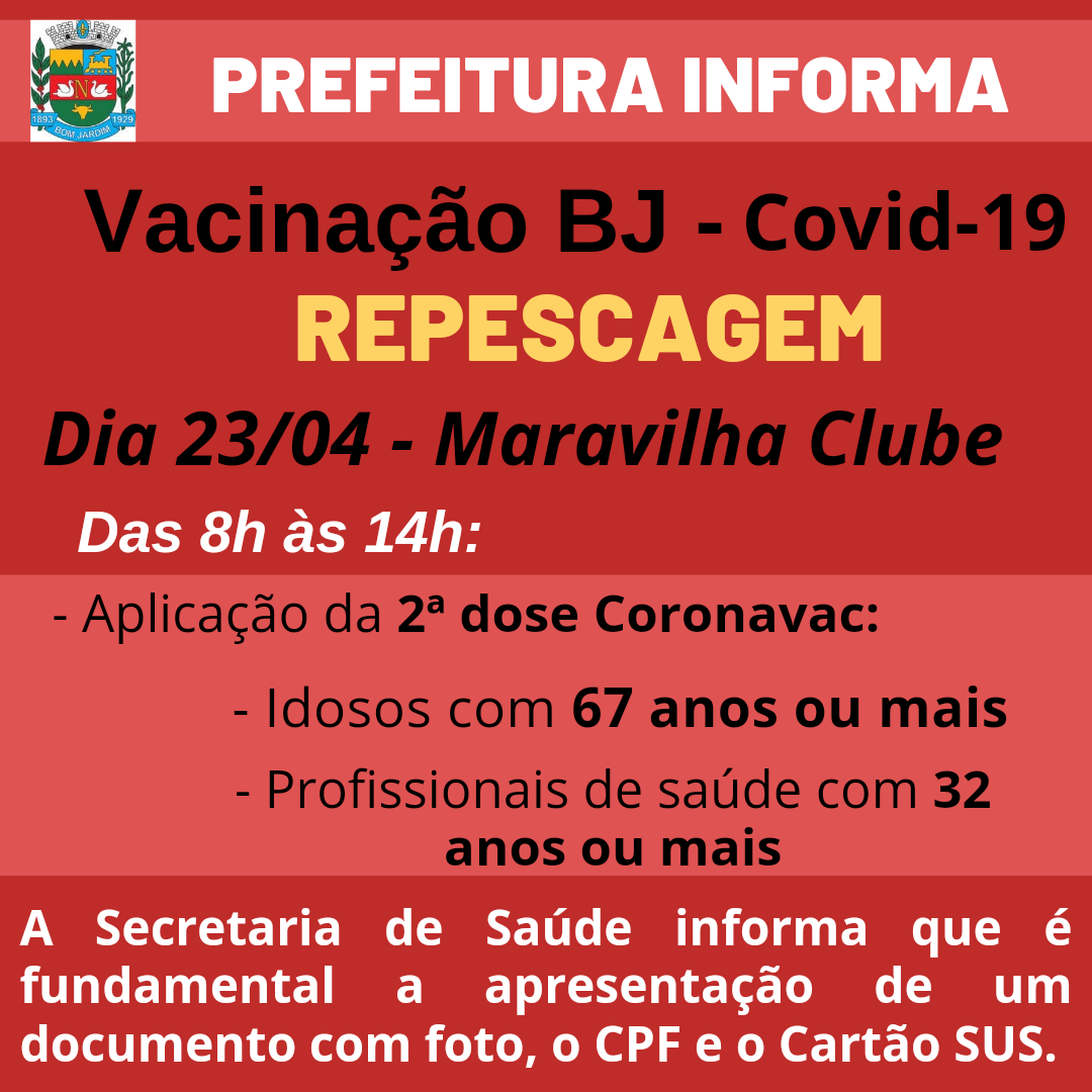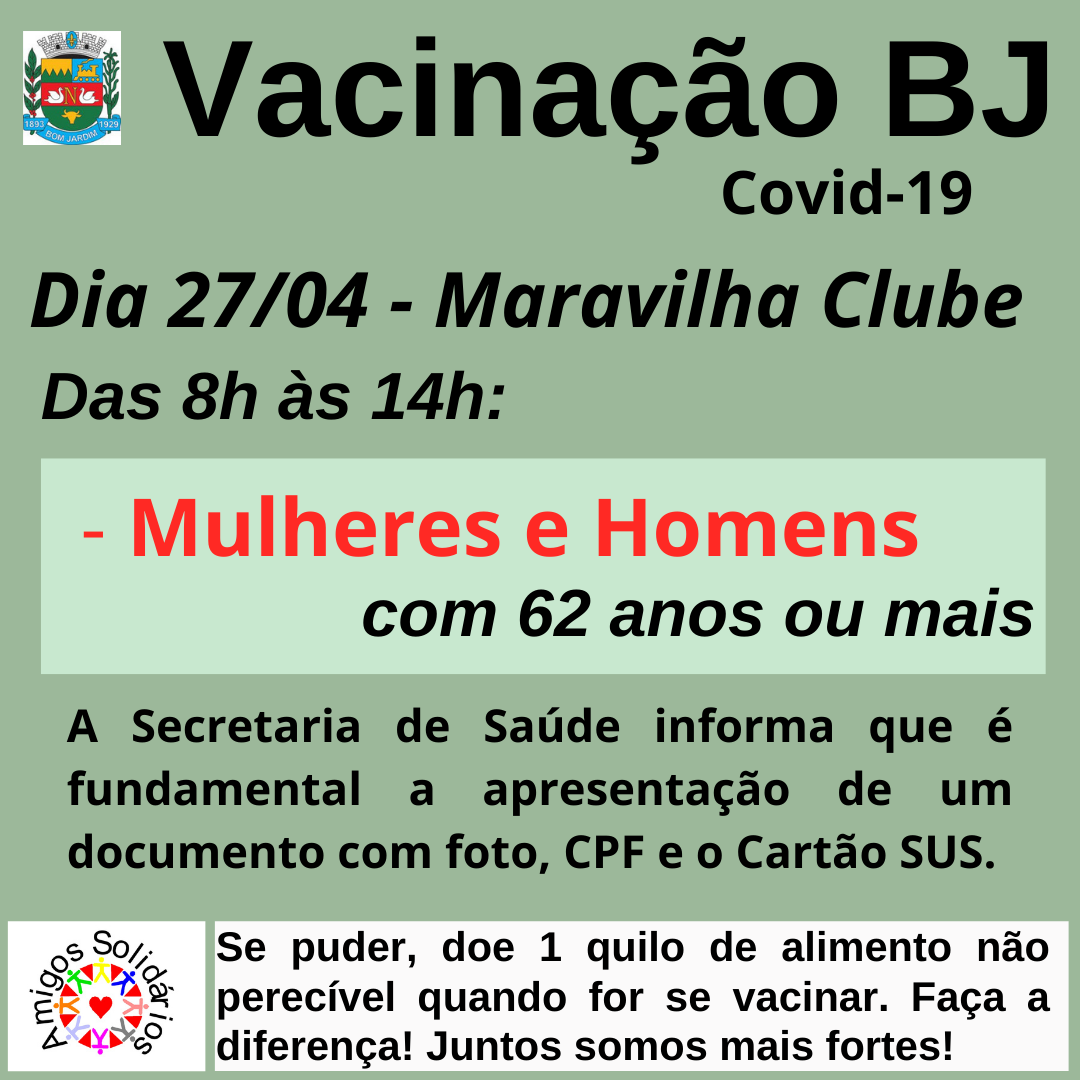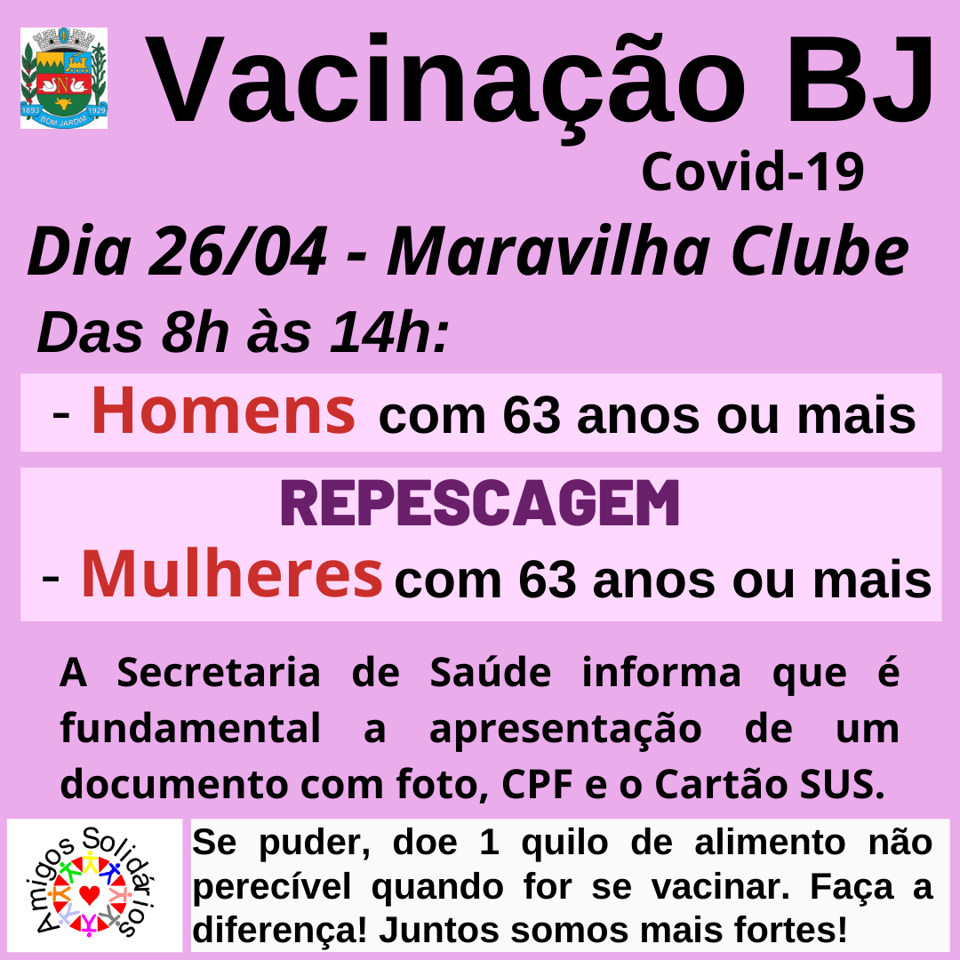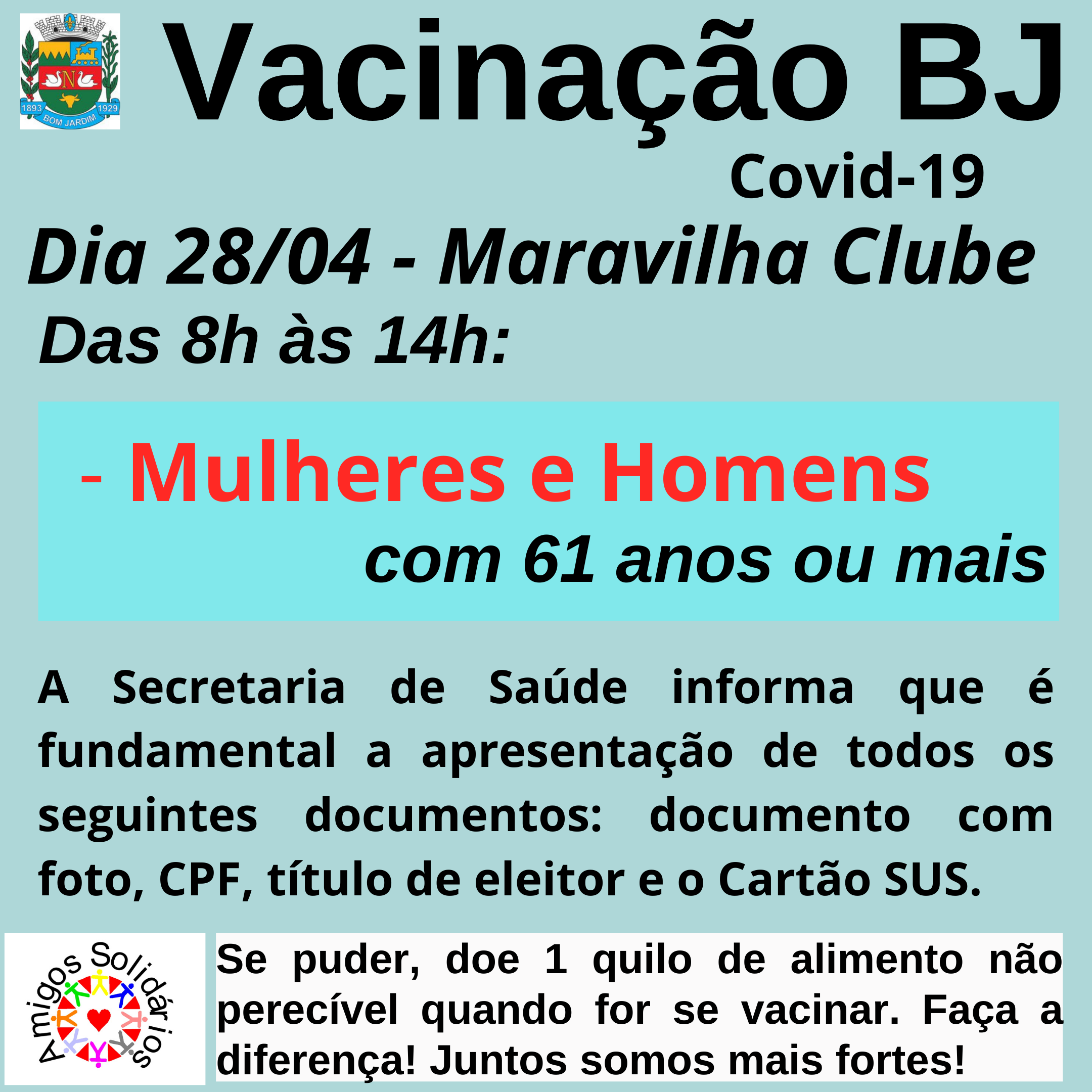 A Secretaria de Saúde de Bom Jardim, seguindo as determinações do Ministério da Saúde, iniciará amanhã, 06, a vacinação contra a Covid-19 em pessoas de 59 anos com comorbidades, além de grávidas e puérperas com comorbidades e o grupo de cuidadores de idosos, atendentes de clínicas e consultórios, e técnicos da área de saúde acima dos 50 anos.A Secretaria alerta que, além dos documentos de Identidade, CPF, Título de Eleitor e CPF, a pessoa deve apresentar a documentação específica definida para cada grupo a ser vacinado.A Campanha de Vacinação contra a Covid-19 em Bom Jardim continua sendo realizada no Maravilha Clube, das 8h às 14h.