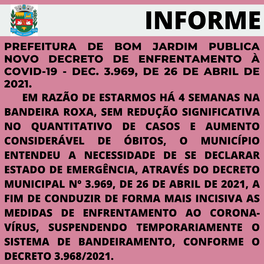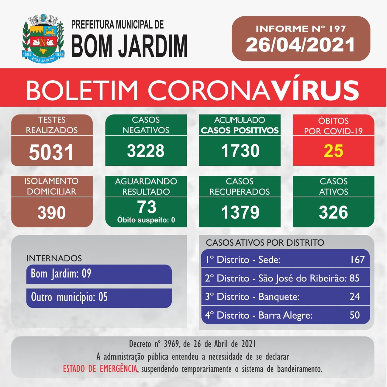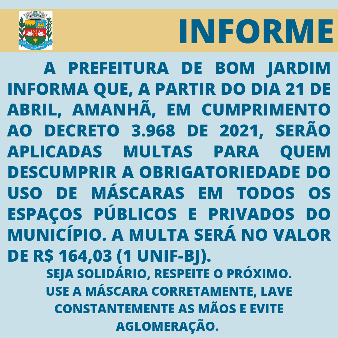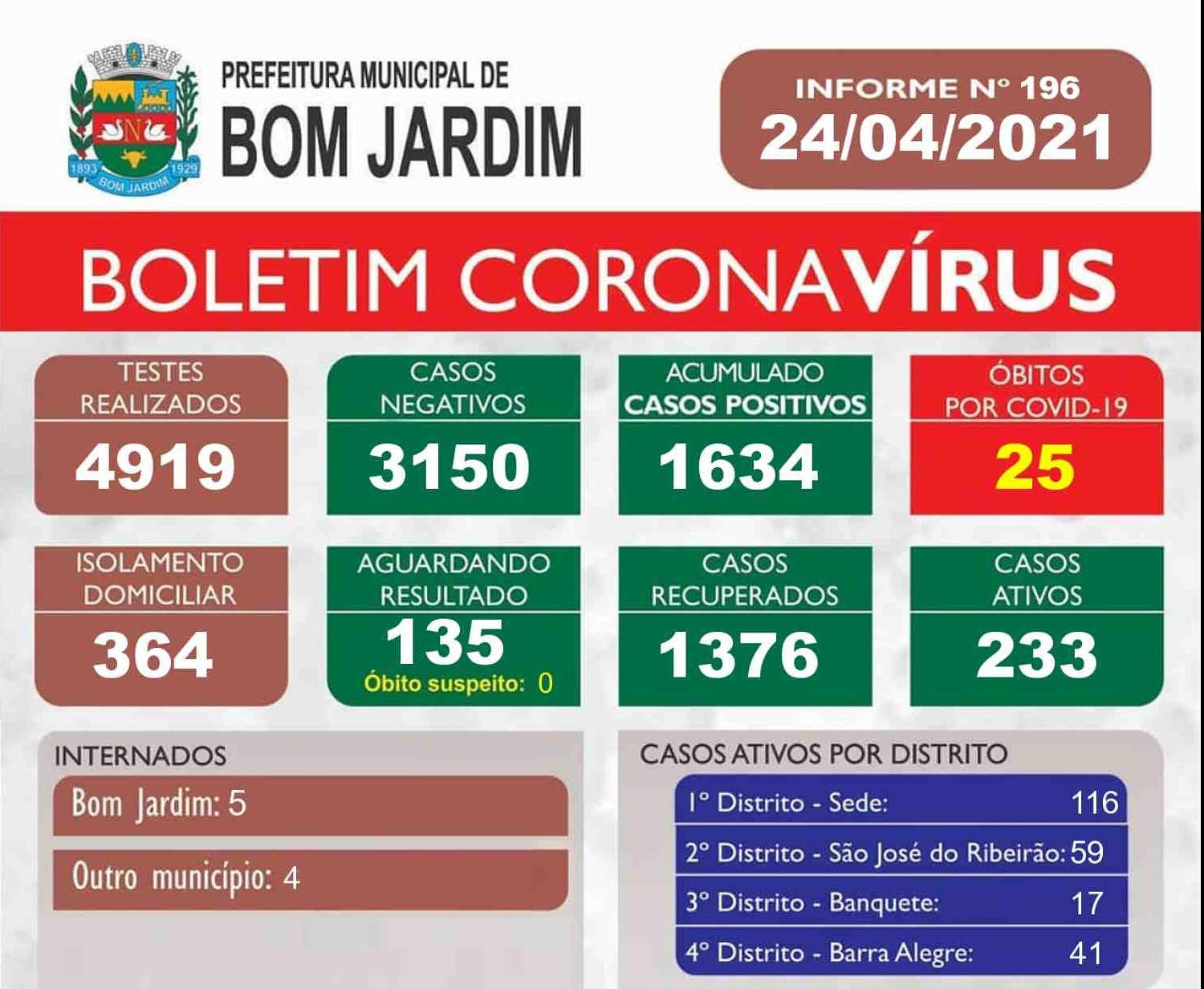 A Secretaria de Saúde de Bom Jardim, seguindo as determinações do Ministério da Saúde, iniciará amanhã, 06, a vacinação contra a Covid-19 em pessoas de 59 anos com comorbidades, além de grávidas e puérperas com comorbidades e o grupo de cuidadores de idosos, atendentes de clínicas e consultórios, e técnicos da área de saúde acima dos 50 anos.A Secretaria alerta que, além dos documentos de Identidade, CPF, Título de Eleitor e CPF, a pessoa deve apresentar a documentação específica definida para cada grupo a ser vacinado.A Campanha de Vacinação contra a Covid-19 em Bom Jardim continua sendo realizada no Maravilha Clube, das 8h às 14h.