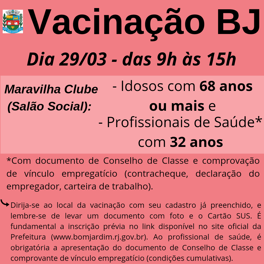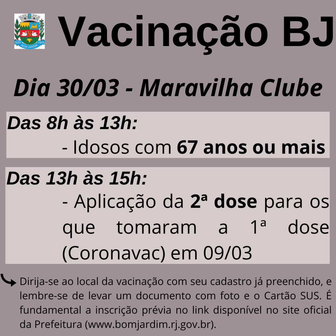 Idosos com 66 anos serão vacinados contra Covid-19 na próxima segundaA Campanha de Vacinação Contra Covid-19 em Bom Jardim imunizará na próxima segunda-feira, dia 12 de abril, idosos com 66 anos ou mais.Já na terça, dia 13, ocorrerá a aplicação da segunda dose para quem tomou a primeira no dia 23/03 - idosos com 72 e 73 anos e profissionais de saúde com 34 anos.A Campanha acontece no Maravilha Clube, das 8h às 14h. Leve seu documento com foto, cartão SUS e faça seu cadastro com antecedência (link disponível aqui no site).