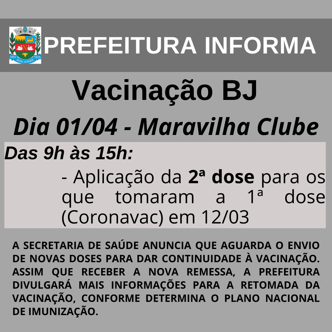 Aplicação da segunda dose em Bom JardimA secretaria de Saúde de Bom Jardim dá continuidade à Campanha de Vacinação contra Covid-19 com aplicação da segunda dose em todos os que receberam a primeira dose da Coronavac no dia 12 de março. A imunização acontece no Maravilha Clube, das 9h às 15h.