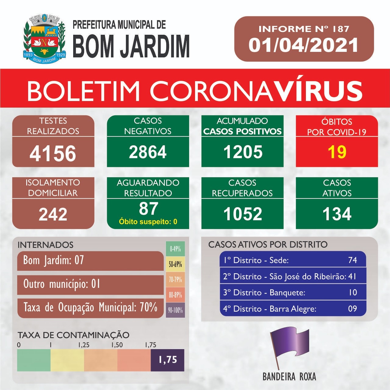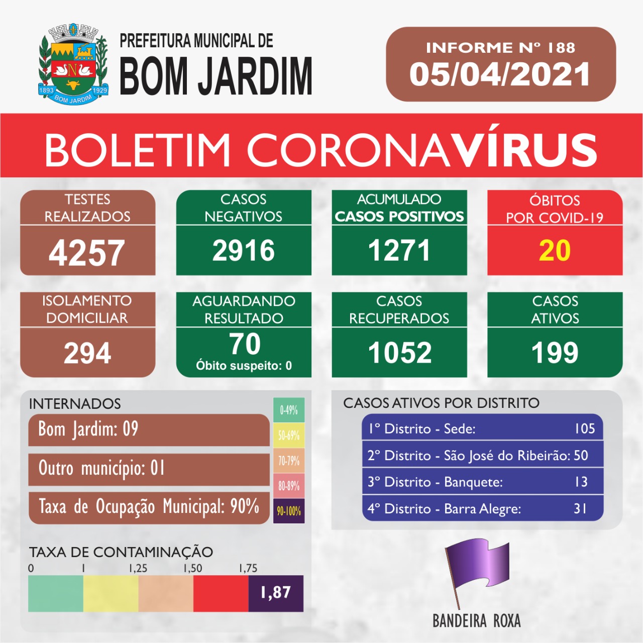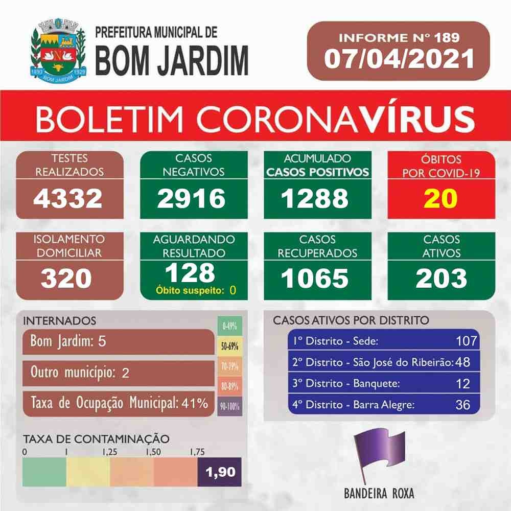 Prefeitura decreta Estado de Emergência para enfrentar a Covid-19Bom Jardim decreta Estado de Emergência para fins de enfrentamento ao Coronavírus.Novo decreto - 3969, de 26 de abril de 2021 - entra em vigência dia 26 de abril e segue até dia 03 de maio.