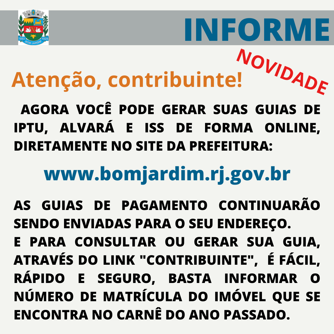Prefeitura de Bom Jardim disponibiliza novos serviços onlineA Prefeitura de Bom Jardim disponibilizou essa semana um novo serviço ao contribuinte: acesso ao IPTU, ao ISS e ao Alvará de forma totalmente digital, através do seu site oficial.A medida visa melhorar e agilizar o andamento do trabalho administrativo, assim como facilitar o dia a dia do contribuinte.Mas não se preocupe, as guias continuarão a ser entregues nas residências através dos Correios.Para ter acesso ao serviço online, basta ter em mãos o número da matrícula do imóvel, informado no carnê do ano anterior, acessar o site e clicar no link "Contribuinte" na página inicial. É fácil, rápido e seguro.