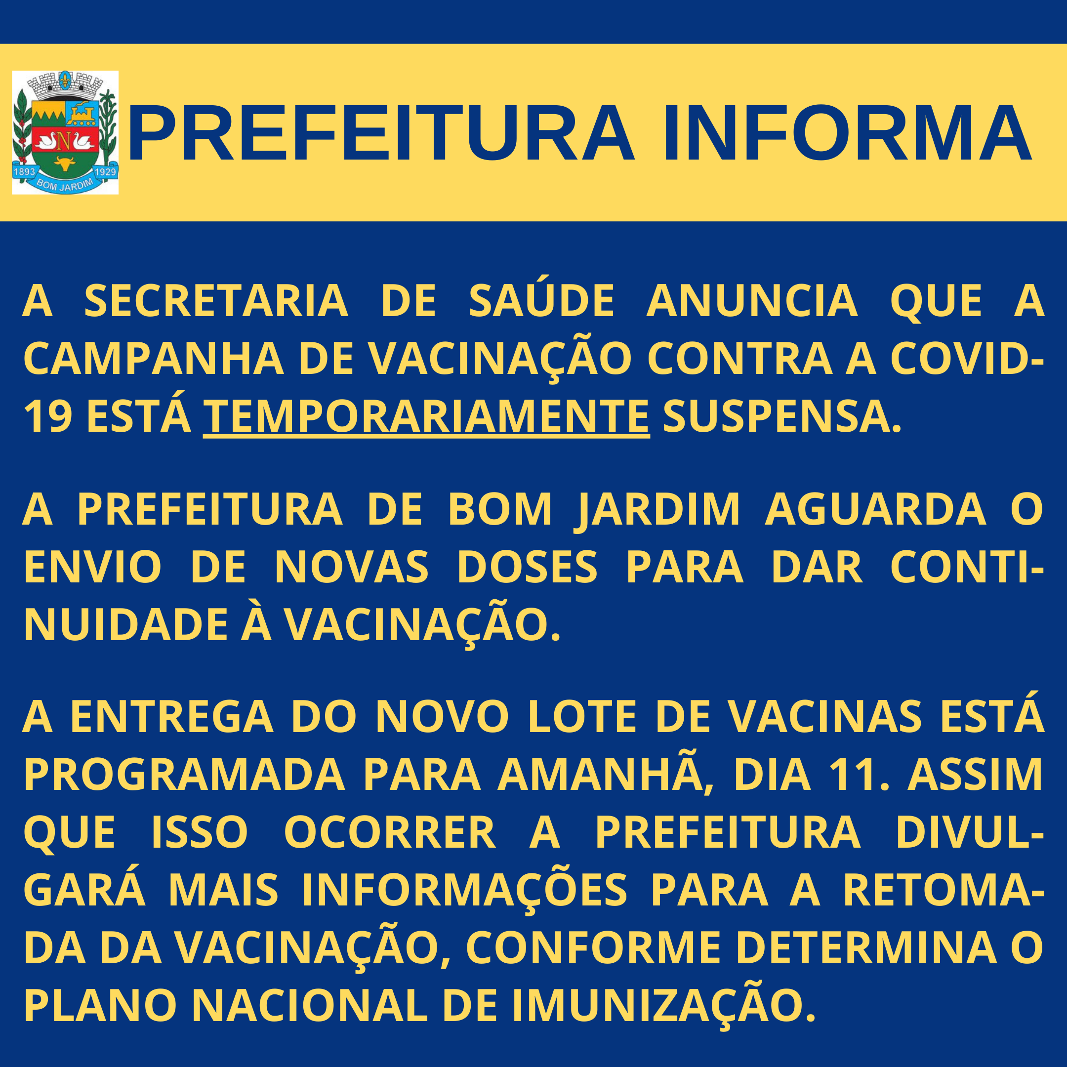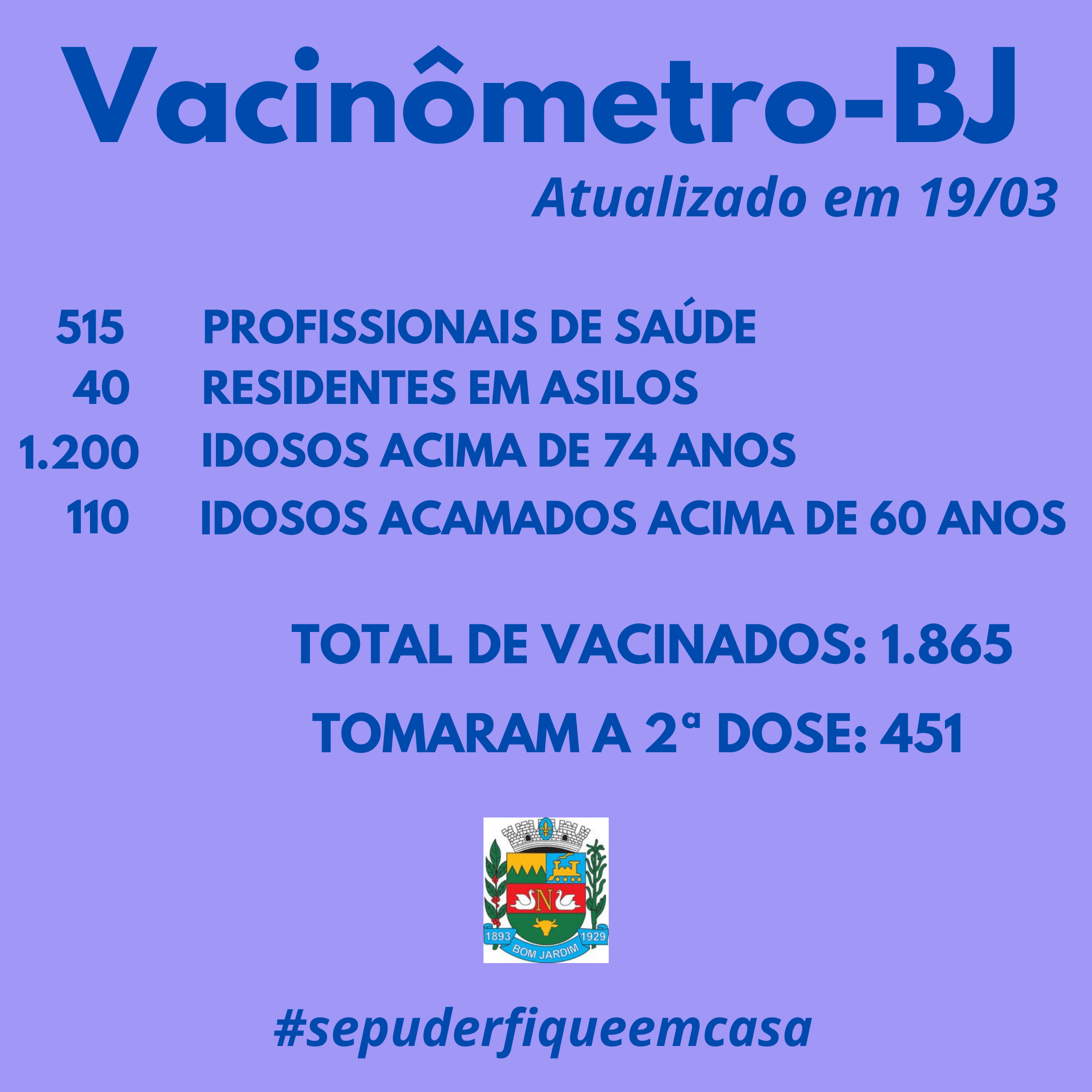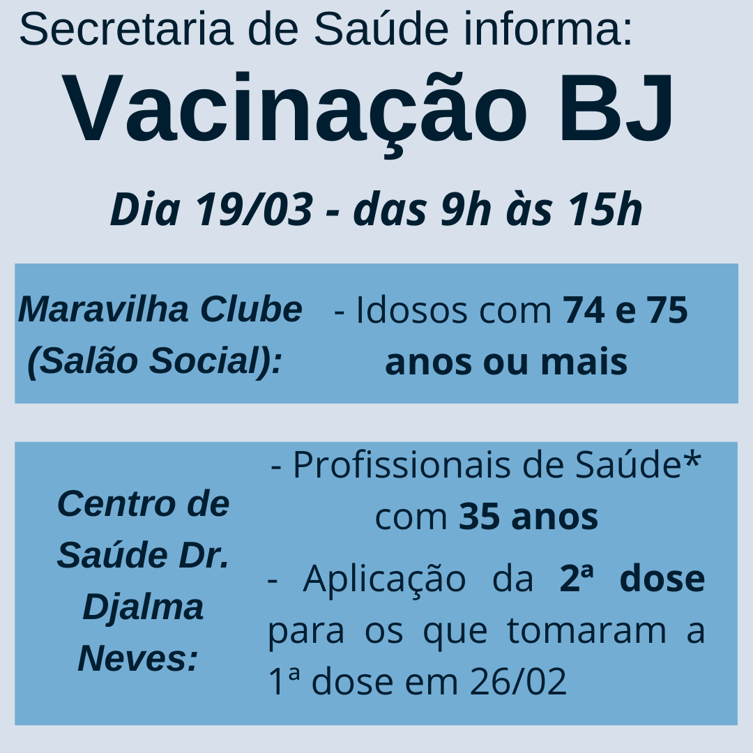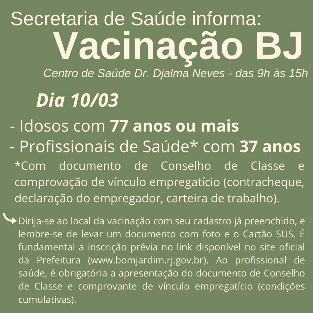 A Secretaria de Saúde de Bom Jardim, seguindo as determinações do Ministério da Saúde, iniciará amanhã, 06, a vacinação contra a Covid-19 em pessoas de 59 anos com comorbidades, além de grávidas e puérperas com comorbidades e o grupo de cuidadores de idosos, atendentes de clínicas e consultórios, e técnicos da área de saúde acima dos 50 anos.A Secretaria alerta que, além dos documentos de Identidade, CPF, Título de Eleitor e CPF, a pessoa deve apresentar a documentação específica definida para cada grupo a ser vacinado.A Campanha de Vacinação contra a Covid-19 em Bom Jardim continua sendo realizada no Maravilha Clube, das 8h às 14h.