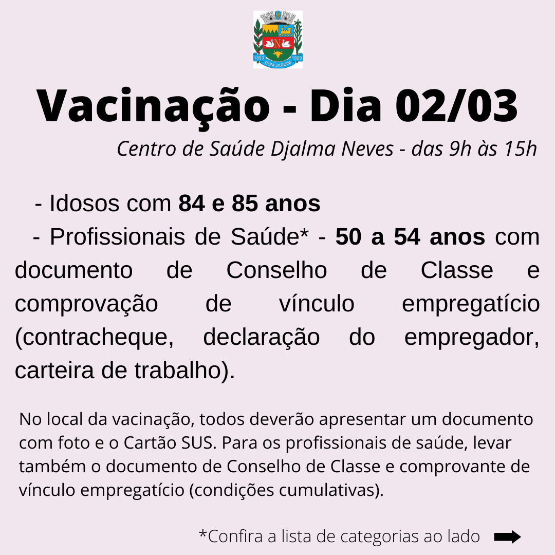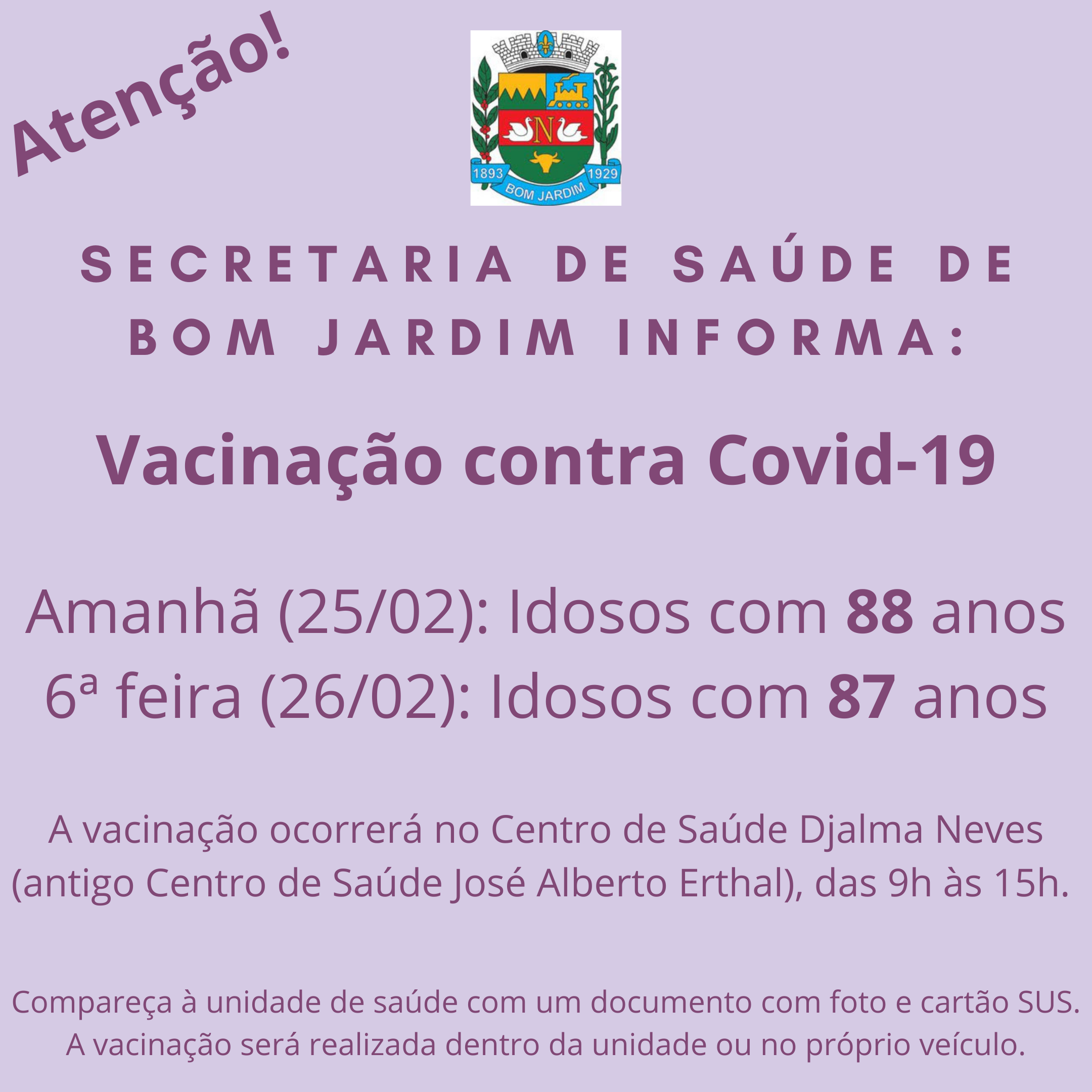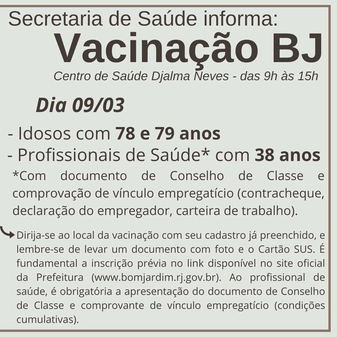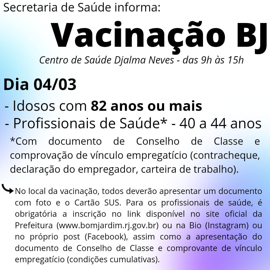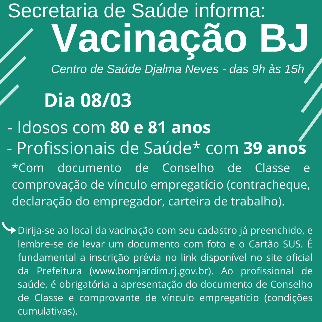 A Secretaria de Saúde de Bom Jardim, seguindo as determinações do Ministério da Saúde, iniciará amanhã, 06, a vacinação contra a Covid-19 em pessoas de 59 anos com comorbidades, além de grávidas e puérperas com comorbidades e o grupo de cuidadores de idosos, atendentes de clínicas e consultórios, e técnicos da área de saúde acima dos 50 anos.A Secretaria alerta que, além dos documentos de Identidade, CPF, Título de Eleitor e CPF, a pessoa deve apresentar a documentação específica definida para cada grupo a ser vacinado.A Campanha de Vacinação contra a Covid-19 em Bom Jardim continua sendo realizada no Maravilha Clube, das 8h às 14h.