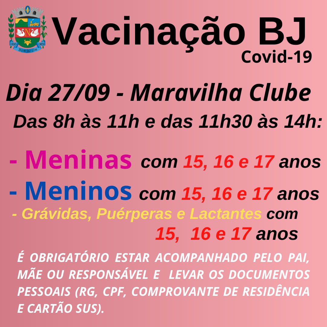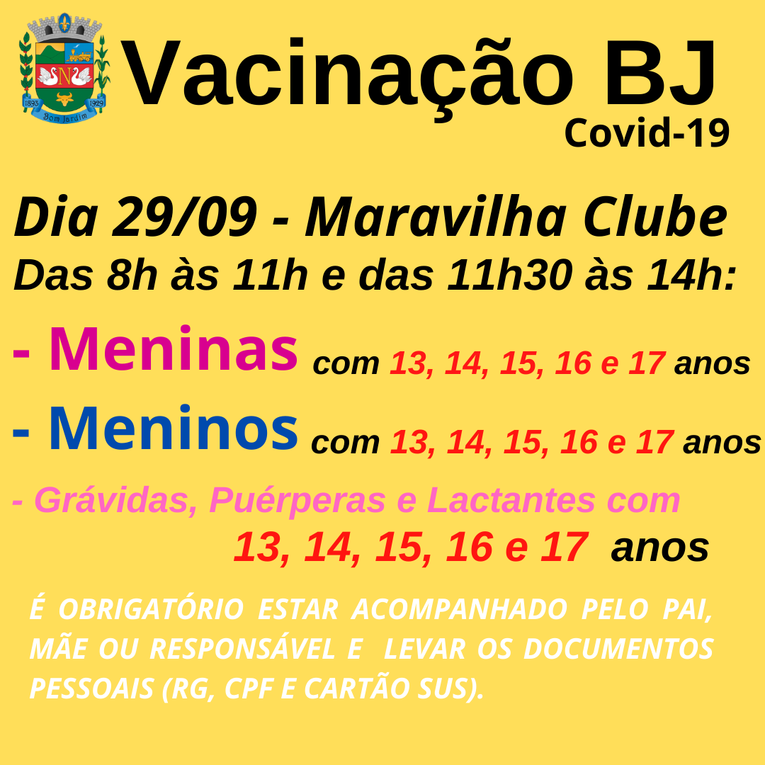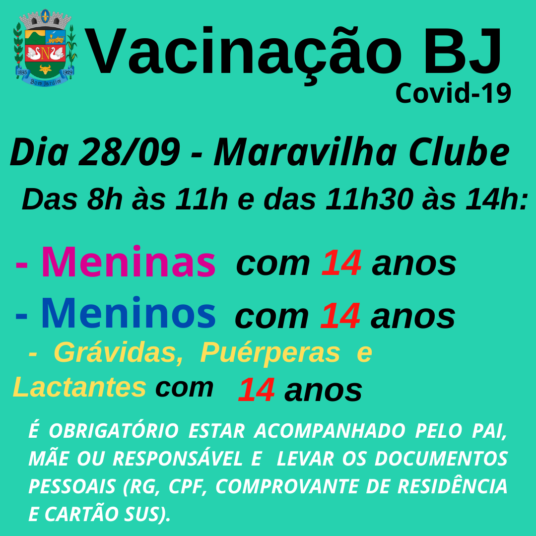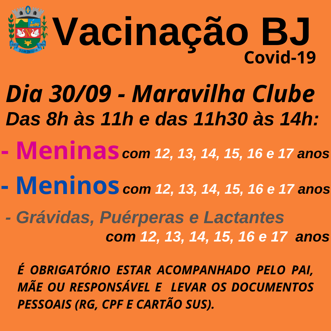 Dose de reforço para idosos com 64 anos ou maisSe você tem 64 anos e tomou a segunda dose da vacina contra Covid-19 há pelo menos 6 meses, dirija-se ao Centro de Vacinação (Bom Jardim Maravilha Clube) e tome a dose de reforço.Vacinas salvam vidas!