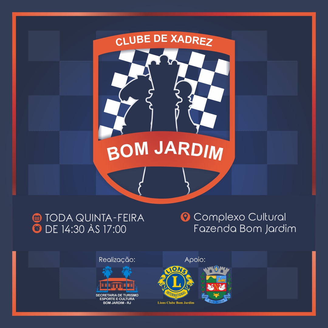 Bom Jardim inicia projeto com aulas de xadrezA Diretoria Municipal de Esporte convida você a participar do Projeto de Clube de Xadrez de BJ. O clube se reunirá no espaço da Fazenda histórica, lugar agradável, tranquilo e ideal para a prática que exige muita concentração. Os encontros serão sempre às quintas-feiras, no período da tarde.Trata-se de um esporte que trabalha lógica e estratégia e, por isso, requer máxima atenção e cuidado no movimentar de peças. Aprenda como exercitar seu cérebro de uma forma divertida e inteligente.Dia: Quinta-FeiraHorário: 14:30 às 17:00 horas.Local: Museu Fazenda Bom Jardim#esportebj#retomandoodesenvolvimento#estamostrabalhando#bomjardimrj